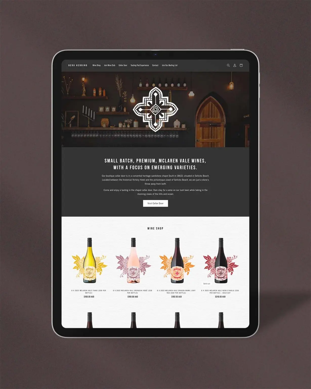 Berg Herring needed an elegant online presence that captured the unique charm of their boutique winery and its stunning coastal location. Positioned between the historic Victory Hotel and Sellicks Beach, it was important that the website reflected both the experience and atmosphere of visiting the cellar door. The goal was to create a visually engaging platform that inspires visits, showcases the setting, and makes it easy for guests to plan their experience.